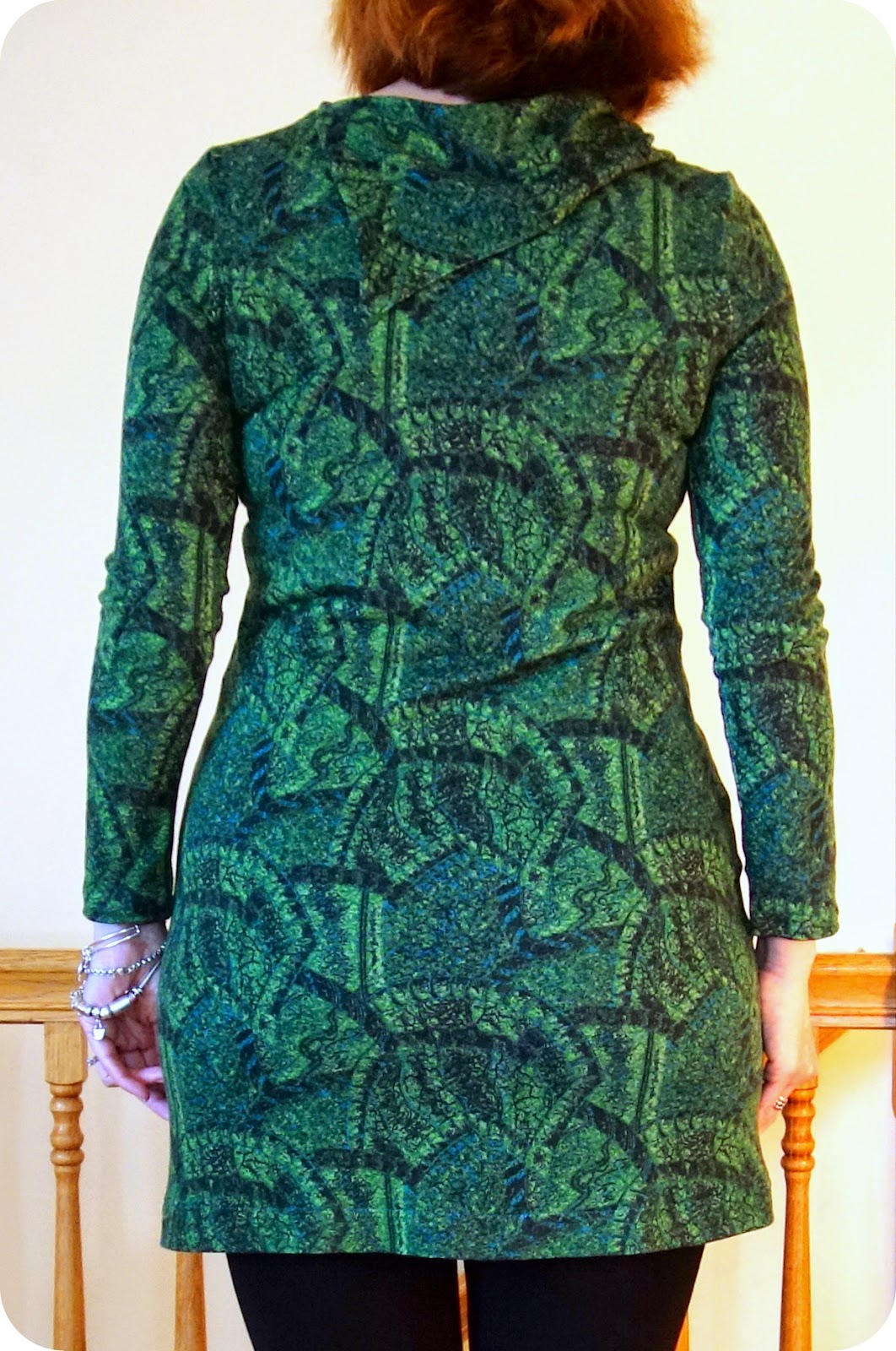 10 at shoulders and waist, graded out to a 12 and 14 at my high and low hip/hem). Though the knit has a good amount of stretch, the print is on a white base, so if the fabric was too stretch too much, the white would come through and make the black background far less black, ruining the effect I was hoping to get.