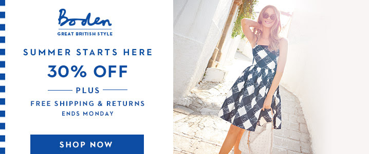 The ‘30% off plus free shipping and free returns when you spend over $49' offer is valid until 23.59 PST on May 25, 2015, is not for resale or publication, and can be used once only. Previous purchases are not eligible for this offer. This offer applies only to personal orders. Orders that are considered to be commercial may be excluded from the offer. Free shipping and returns apply to your first order, only within the USA and only to orders where the total spend after discounts is greater than or equal to $49. Free shipping applies to standard shipping. If an item is returned that brings the total spend below the qualifying level, the offer value may be deducted from any refund. Boden gift cards, Preview, Men's Cheaney Shoes, Sale and Clearance items are excluded from this offer.